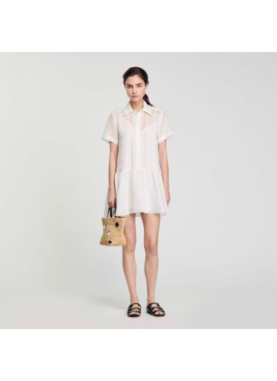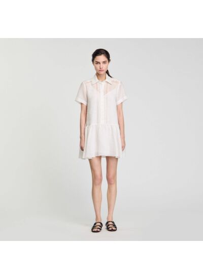 Robe courte munie d'un col chemise, de manches courtes, d'une fermeture boutonnée et ornée de galons de dentelle.