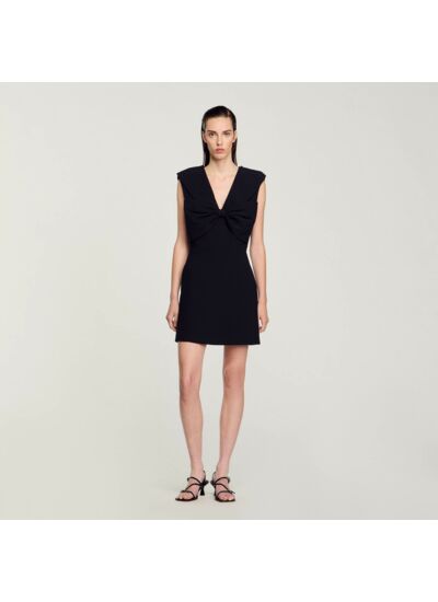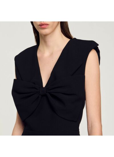 Robe courte sans manches et épaulée munie d'une encolure en V, et ornée d'un nœud oversize devant.