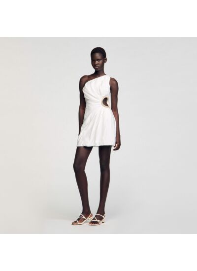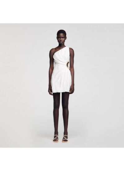 Robe courte asymétrique à effet drapé, soulignée d’une découpe ajourée sur le côté bordée de strass.