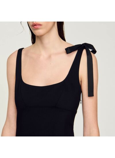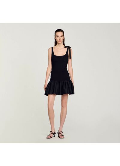 Robe courte galbante en mix de matières, munie de bretelles dont une à nœud, d'une encolure ronde devant et au dos et d'une jupe volantée volumineuse.