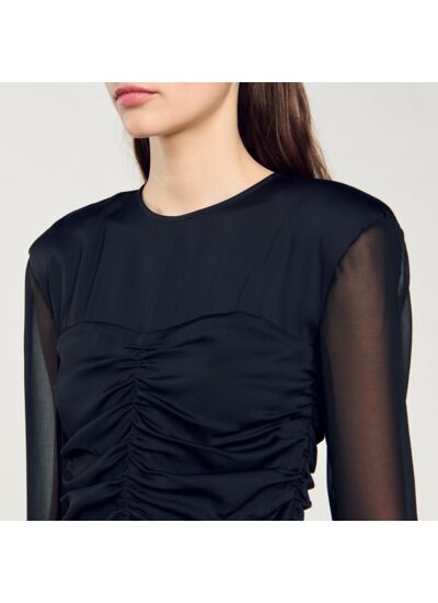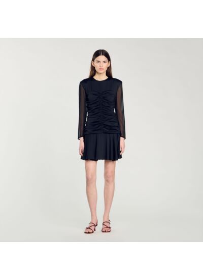 Robe courte drapée Sandro Femme Col rond Manches longues transparentes Drapée devant Doublée