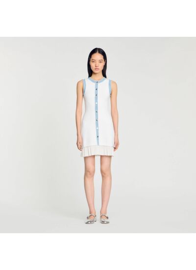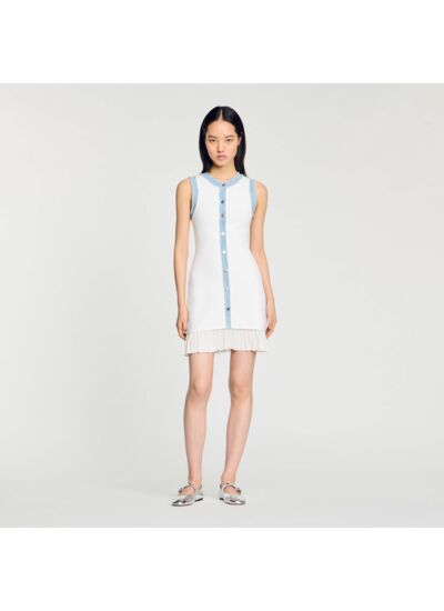 Robe courte en maille Sandro Femme Empiècements denim Col rond Sans manches Patte de boutonnage Volant plissé sur le bas