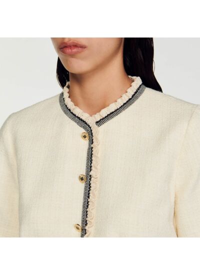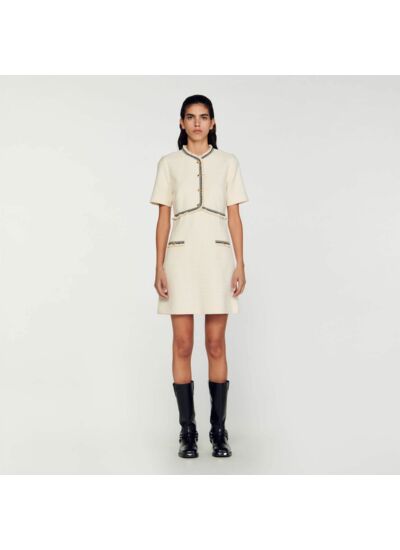 Cette robe courte en tweed Sandro est-elle adaptée pour un look professionnel ? Oui, son tissu en tweed et sa coupe courte offrent une élégance moderne qui convient parfaitement à un environnement professionnel tout en restant féminine et tendance. Comment entretenir cette robe en tweed ? Il est recommandé de suivre les instructions de lavage indiquées sur l’étiquette, généralement un nettoyage à sec pour préserver la texture et la qualité du tweed. Cette robe convient-elle pour des occasions spéciales ? Absolument, sa finition raffinée et son style intemporel en font un choix idéal pour des événements formels ou des sorties chics. Quelle taille choisir pour un ajustement parfait ? La robe Sandro suit les tailles standards ; pour un ajustement optimal, consultez notre guide des tailles ou contactez notre service client pour un conseil personnalisé. Cette robe peut-elle se porter en toutes saisons ? Oui, le tweed est un tissu polyvalent qui s’adapte bien aux saisons plus fraîches, mais peut aussi être stylisé avec des accessoires légers pour les mi-saisons.
