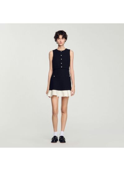 Robe courte sans manches en tweed munie d'une patte de boutonnage à boutons perlés, et d'un volant contrasté en bas de jupe.