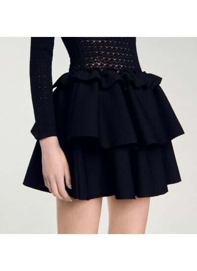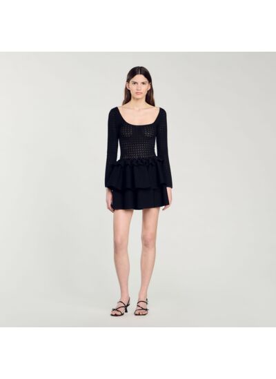 Robe effet trompe l'œil munie d'un haut en maille à col rond et manches longues, et d'une jupe volumineuse à volants.