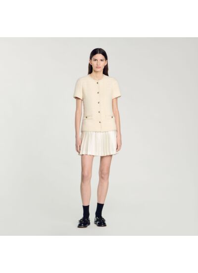 Robe effet 2 en 1 en tweed et matière satinée, munie d'un haut effet veste à col rond, manches courtes, fermeture boutonnée à boutons dorés et galons aux poches, ainsi que d'une jupe courte satinée plissée et fluide.