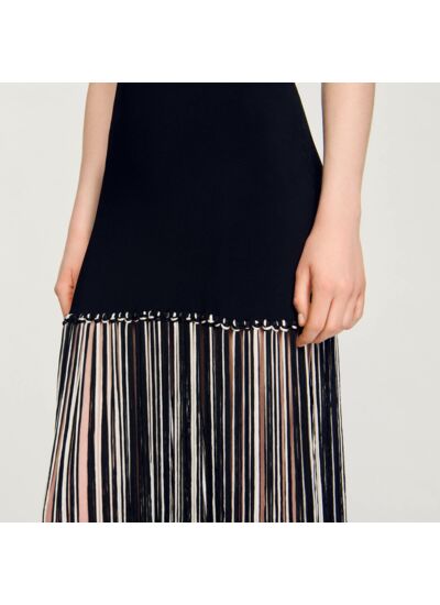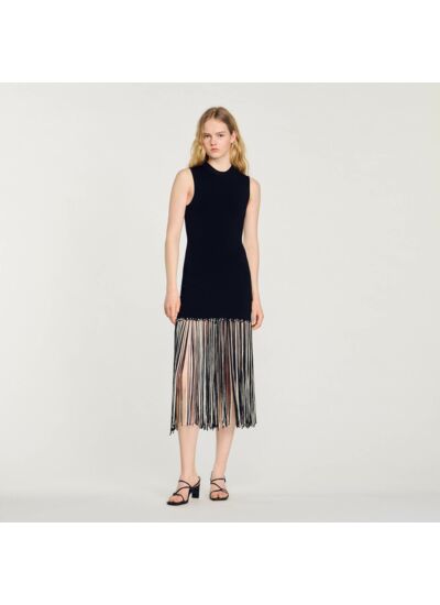 Robe en maille sans manches munie d'un col rond et ornée de longues franges contrastées sur le bas.