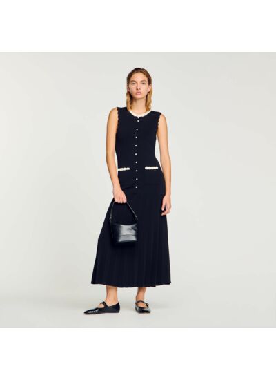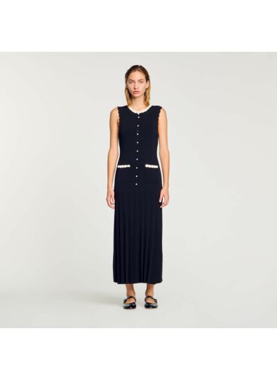 Robe longue sans manches en maille stretch, munie d'un col rond, d'une patte de boutonnage, d'une jupe plissée, de poches plaquées et ornée de détails crochetés contrastés aux bords et aux poches