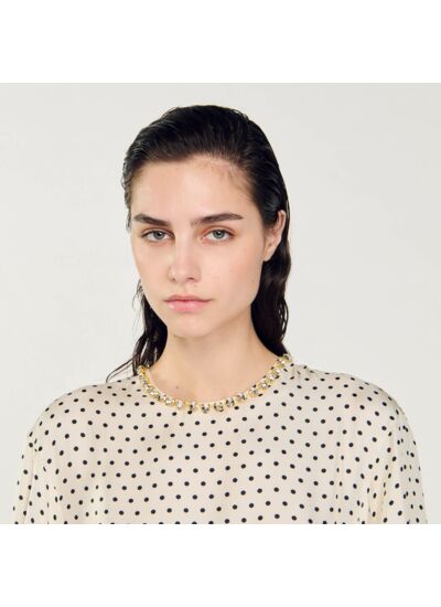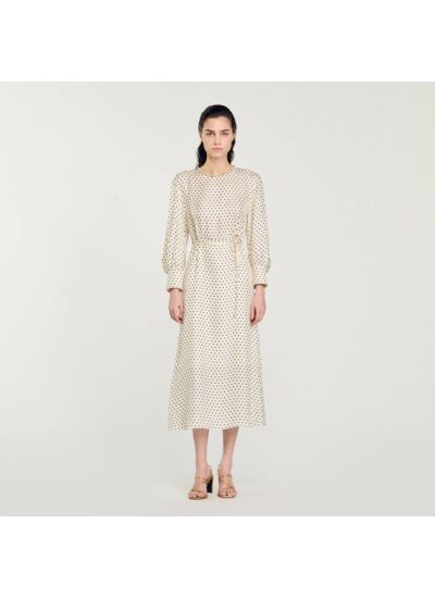 Robe longue et fluide ornée de pois contrastés, munie d'un col rond strassé, de manches longues à poignets boutonnés et d'une ceinture amovible à nouer à la taille.