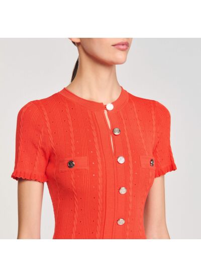Robe longue en maille à points fantaisies, munie d'un col rond, d'une fermeture boutonnée, de manches courtes et d'un bas de jupe évasé.