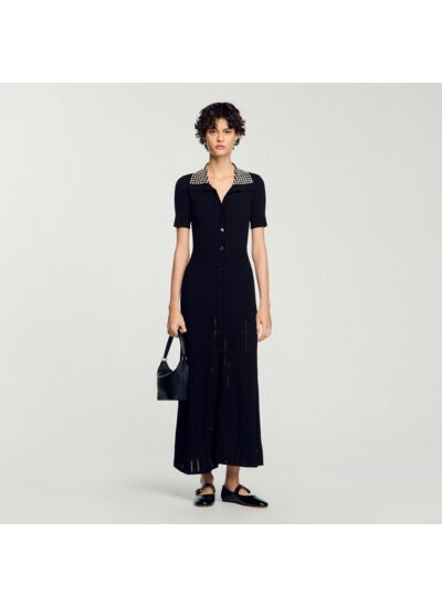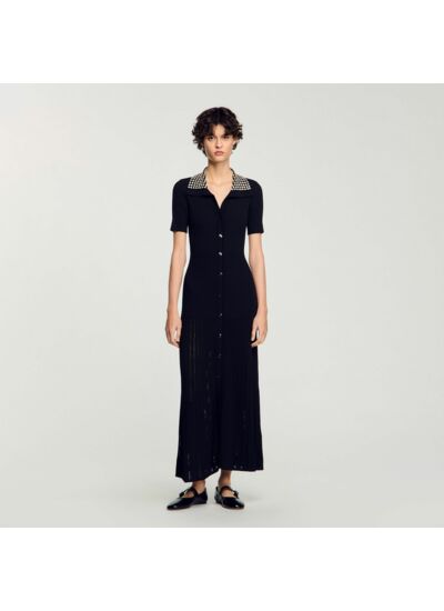 Robe longue en maille munie d'un col vareuse orné de studs, d'une patte de boutonnage et de manches courtes.
