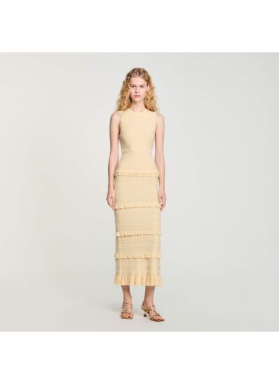 Robe en maille fantaisie sans manches, munie d'un col rond, de volants à la taille et en bas de jupe