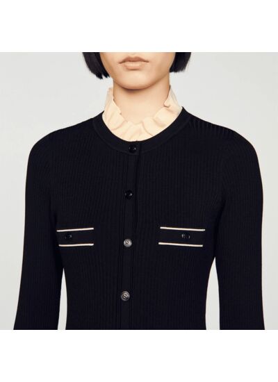 Consultez notre guide des tailles Sandro, car la maille côtelée offre une certaine élasticité, mais il est important de choisir la taille correspondant à vos mesures pour un tombé impeccable.