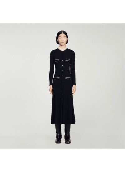 Robe longue en maille côtelée à la coupe très près du corps, munie d'un col montant volanté contrasté, de manches longues, de fausses poches contrastées, et d'une fermeture à boutons fantaisie.
