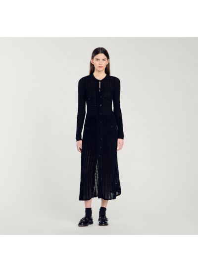 Robe longue en maille effet velours ajouré munie d'une fermeture boutonnée, de manches longues et de poches passepoilées.