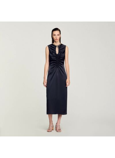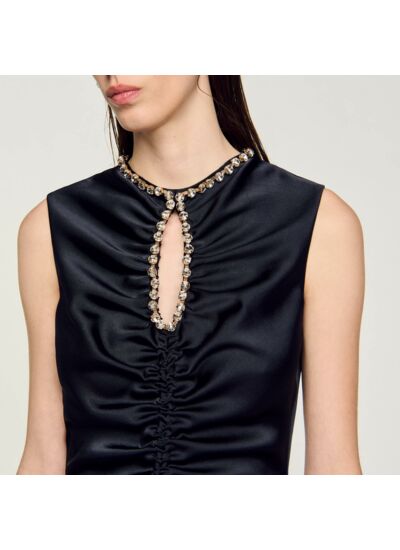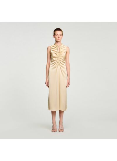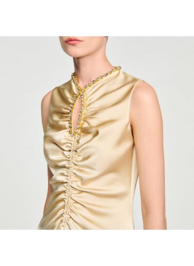 Robe sans manches satinée munie d'un col rond ouvert en goutte, et ornée d'un jeu de fronces sur le devant.