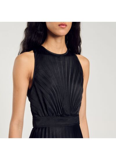 Robe longue et fluide sans manches à plissé soleil, munie d'un col rond, d'une ceinture surpiquée à la taille, et d'une découpe ajourée en goutte sur le devant.
