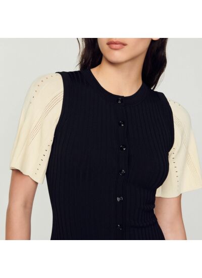 Robe midi en maille côtelée munie d'un col rond, de manches courtes contrastées et d'une fermeture boutonnée