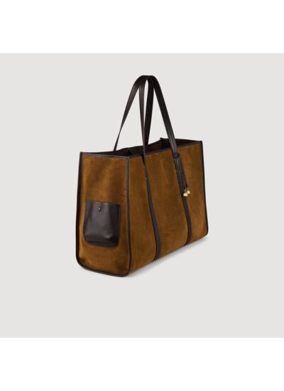 Grand cabas en suede muni d'une patte aimantée, d'une poche latérale et d'anses en cuir.