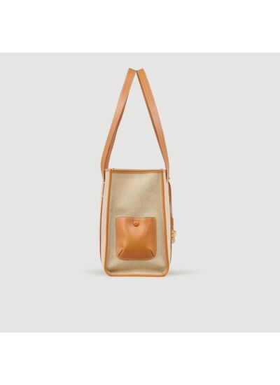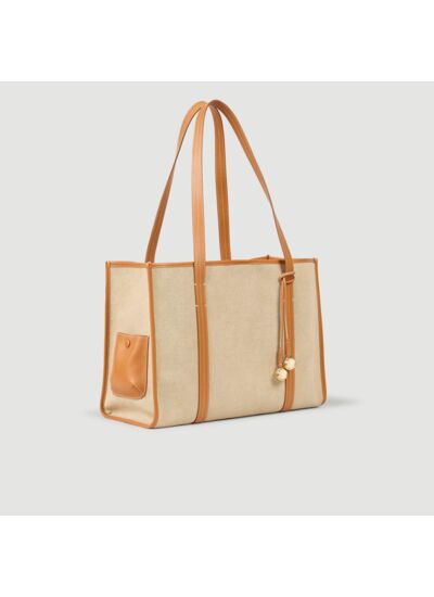 Sac cabas en toile muni d'anses en cuir offrant un porté épaule.