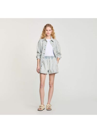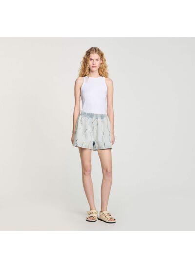 Short en jean strassé et perlé en vagues verticales, muni d'une taille élastiquée.