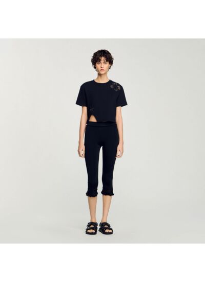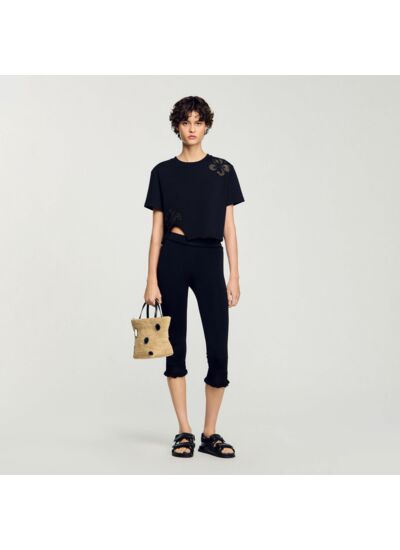 T-shirt à col rond et manches courtes orné d'une broderie fleur hawaïenne ajourée et perlée et d'une découpe à la taille.