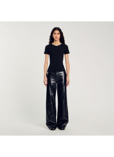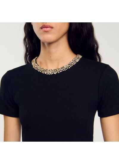 T-shirt muni de manches courtes et d'un col rond orné de strass.