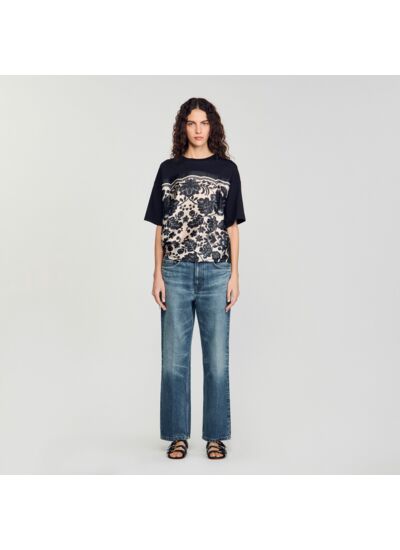 T-shirt à col rond et manches courtes, muni d'un empiècement foulard orné d'un imprimé fleuri.