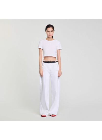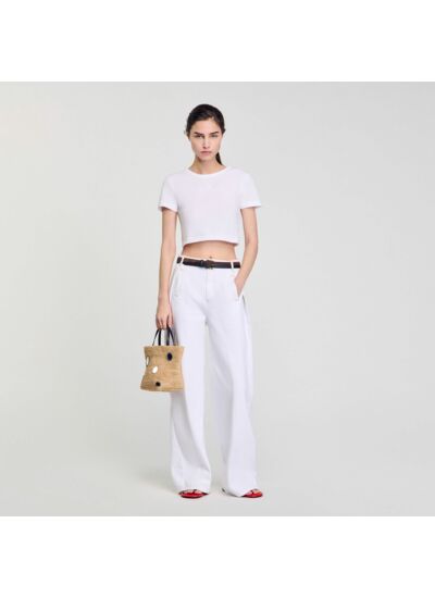 Ce t-shirt court Sandro est-il adapté à un style casual ou plus habillé ? Ce modèle s’adapte parfaitement à un style casual chic. Sa coupe courte et sa qualité de fabrication en font une pièce idéale pour un look décontracté mais soigné, à associer avec un jean taille haute ou une jupe élégante.