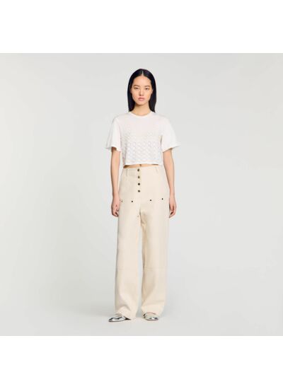 Ce t-shirt court perlé Sandro est-il adapté à un style casual chic ? Oui, son design court et les détails perlés apportent une touche élégante qui s’intègre parfaitement à un look casual chic, idéal pour sublimer un jean ou une jupe.