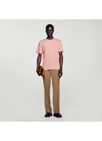 Quelles sont les caractéristiques du t-shirt en lin Sandro ? Ce t-shirt est confectionné en lin certifié, garantissant une matière naturelle, légère et respirante. Il offre un confort optimal tout en assurant une tenue élégante et durable, idéale pour un style casual chic.