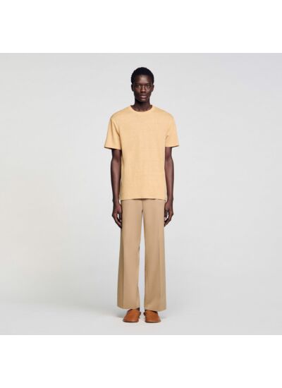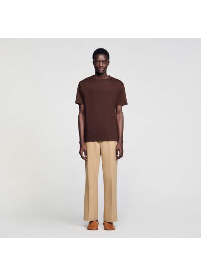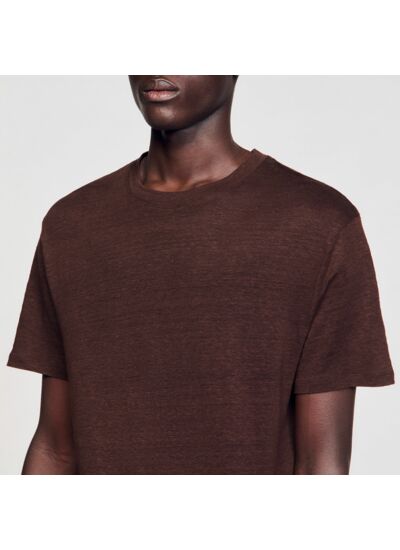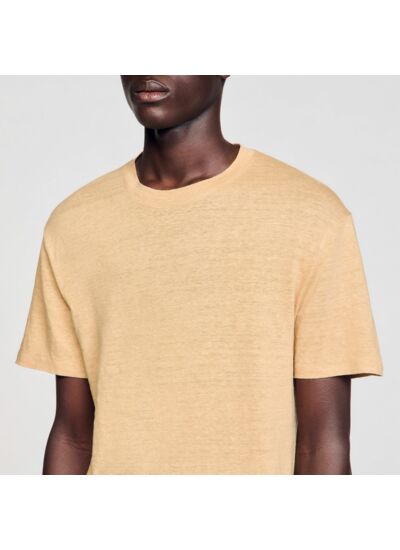 Quelles sont les caractéristiques du t-shirt en lin Sandro ? Ce t-shirt est confectionné en lin certifié, garantissant une matière naturelle, légère et respirante. Il offre un confort optimal tout en assurant une tenue élégante et durable, idéale pour un style casual chic.