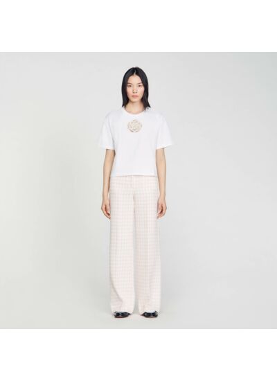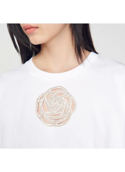 Tee-shirt à col rond et manches courtes orné d'une rose strassée brodée à la poitrine.