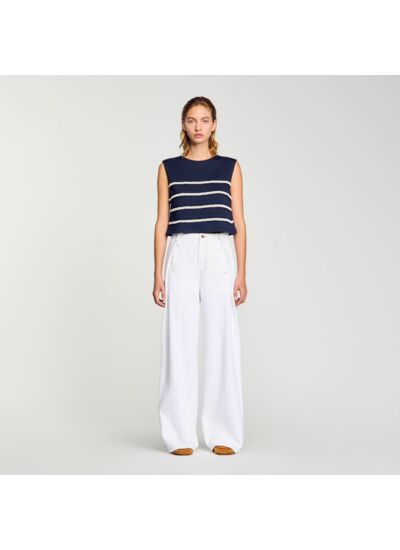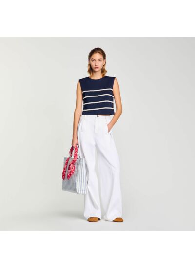 Ce t-shirt sans manches marinière Sandro est-il adapté pour un look estival ? Oui, sa coupe sans manches et son motif marinière en font une pièce légère et stylée, idéale pour les journées chaudes tout en restant élégante.