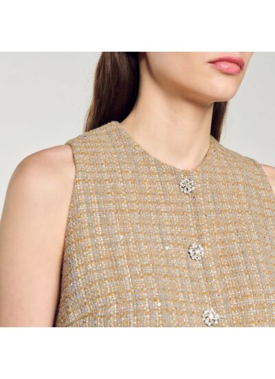 Top court en tweed fantaisie à motif carreaux, orné de boutons bijou.