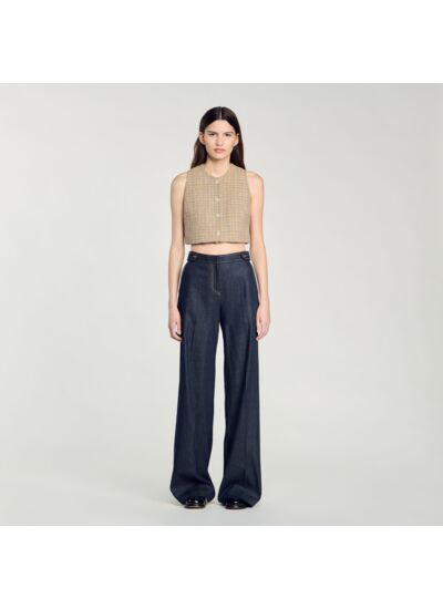 Ce top court en tweed à carreaux est-il adapté à un look professionnel ? Ce top allie élégance et modernité, parfait pour un style professionnel chic associé à un pantalon tailleur ou une jupe crayon. Sa coupe courte et son tissu structuré apportent une touche contemporaine sans sacrifier le raffinement.