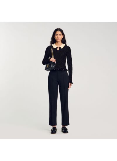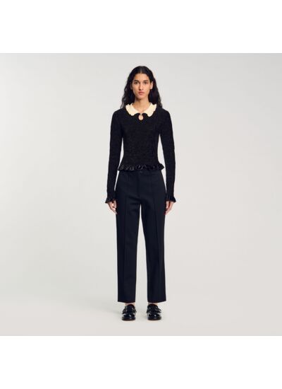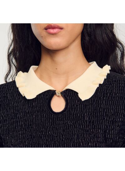 Top smocké en velours muni de manches longues, d'un col contrasté volanté orné d'un bouton bijou et d'une ouverture ajourée en goutte.