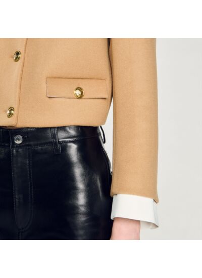 Veste courte en laine mélangée munie d'un col rond, de manches longues à poignets amovibles contrastés et d'une fermeture à boutons travaillés.