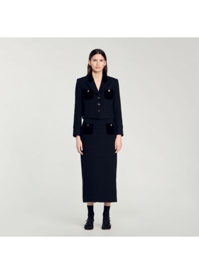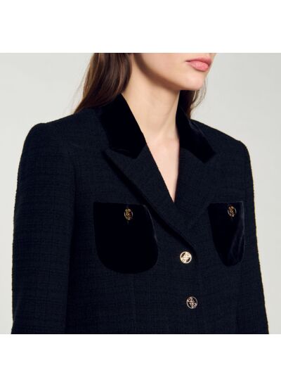 Veste courte en tweed et velours munie de manches longues, d'une fermeture boutonnée et de poches plaquées à la poitrine.
