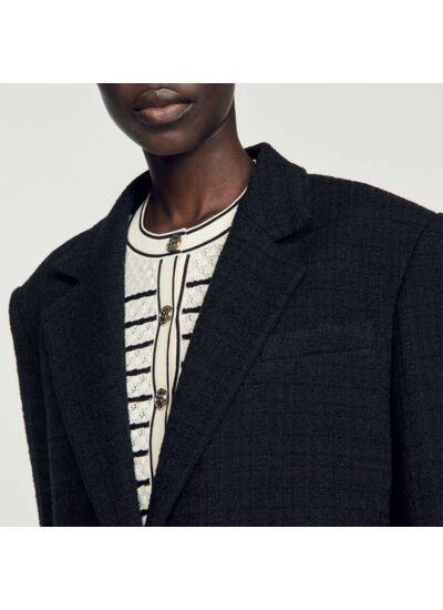 Cette veste de costume en tweed Sandro est-elle adaptée à un usage professionnel ? Oui, son tissu en tweed confère une allure élégante et structurée, idéale pour un environnement professionnel tout en apportant une touche de modernité à votre tenue.