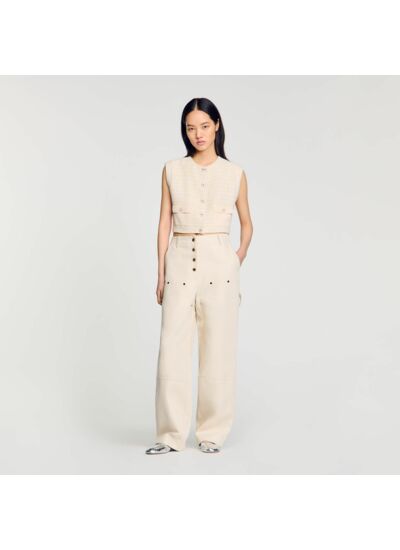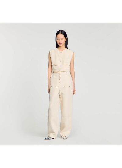 Veston court sans manches en tweed fantaisie muni d'un col rond, d'une patte de boutonnage et de poches plaquées en crochet.