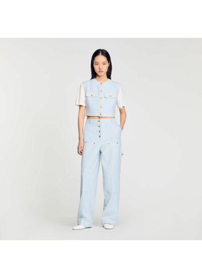 Veston court sans manches en tweed fantaisie orné d'empiècements en denim, muni d'un col rond, d'une patte de boutonnage à boutons officiers et de poches à rabat boutonné.