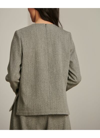 La blouse Clarisse se distingue par sa coupe ajustée qui épouse délicatement le corps, offrant un rendu à la fois structuré et confortable. Son col rond classique et l’ouverture zippée au dos apportent une touche contemporaine, tandis que les fentes latérales en bas du corps assurent une liberté de mouvement optimale. La texture en sergé de laine gris chiné confère une allure sophistiquée, idéale pour vos journées au bureau ou vos sorties urbaines.