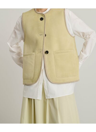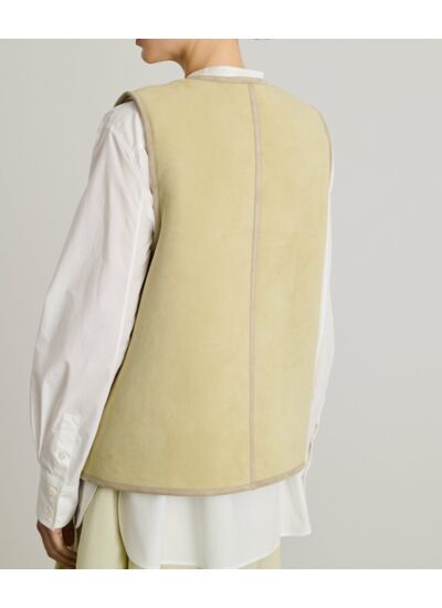 Blouson sans manches à coupe droite, encolure ronde, ouverture boutonnée devant. Deux poches plaquées sur le devant. Confectionné en cuir d’agneau retourné, 100% cuir d’agneau. Nettoyage professionnel recommandé.