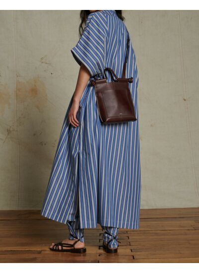 100% coton. Lavage en machine à 30°C. Blanchiment interdit. Séchage en tambour à température modérée. Repassage à 110°C maximum. Nettoyage à sec avec solvant normal. Bob réversible uni et rayé, popeline de coton rayée bleu et blanche réversible en chambray bleu marine. Marque : Soeur.