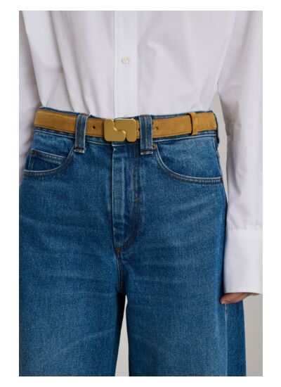 Conçue en cuir glacé camel et ocre, cette ceinture fine de 3 cm de largeur s’impose par son fermoir monogramme "S" en métal doré, signature exclusive de Soeur. Inspirée du sac iconique BELLISSIMA, elle apporte une finition raffinée et un twist moderne à un jean ou un pantalon classique. Sa texture en croûte de cuir de vache garantit une tenue durable et un confort optimal.