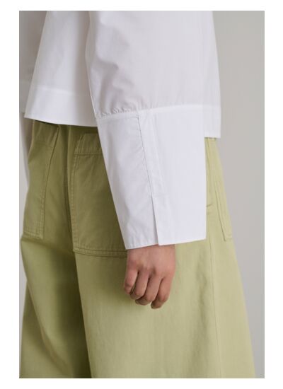 100% coton. Blouse courte à col bateau en popeline de coton blanche. Coupe évasée et courte. Manches longues avec empiècements aux poignets. Col bateau avec incrustations.