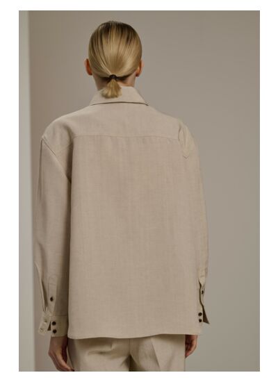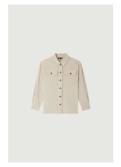 Composition : 57% viscose, 43% lin. Coupe droite et ample. Col chemise. Ouverture boutonnée devant. Deux poches poitrine plaquées. Marque : Soeur.