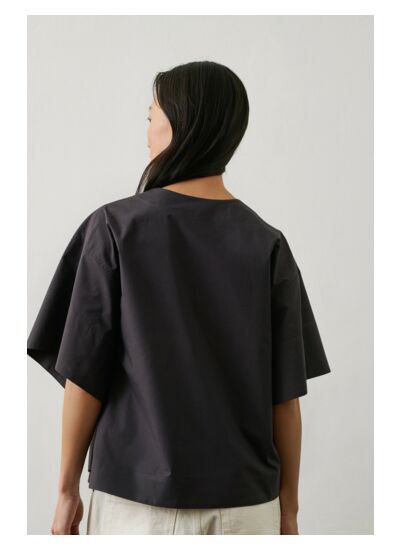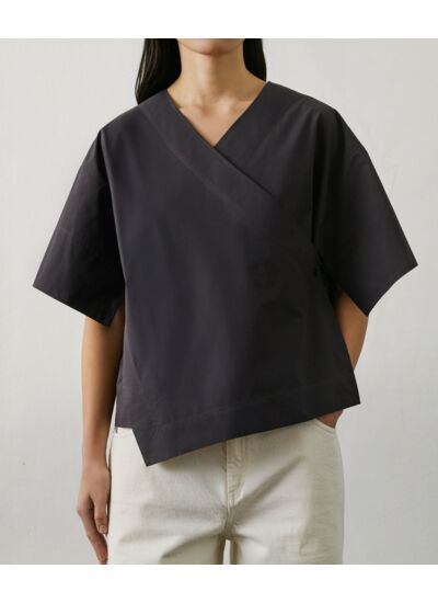 Confectionnée en popeline de coton structuré, cette blouse à manches courtes larges offre un confort optimal tout en valorisant votre silhouette. Le panneau avant maintenu par un bouton souligne l’asymétrie élégante de ce modèle, inspiré du kimono, pour un rendu fluide et moderne.