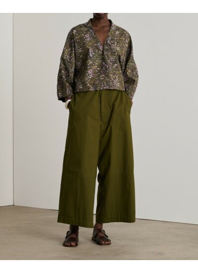 Coupe ample, col en V avec ouverture boutonnée devant, manches 3/4 avec pinces, popeline de coton imprimée, longueur courte. Composition : 100% coton organique.